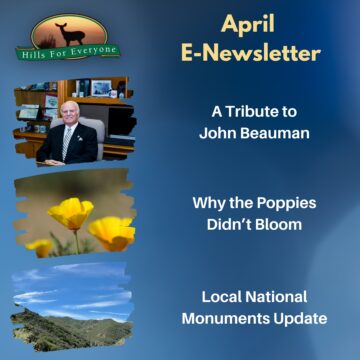 The Hills For Everyone e-newsletter features upcoming Earth Day events, a tribute to Councilmember John Beauman, a description of why the poppies didn’t bloom, and context on the local National Monument campaigns. View our E-Newsletter.